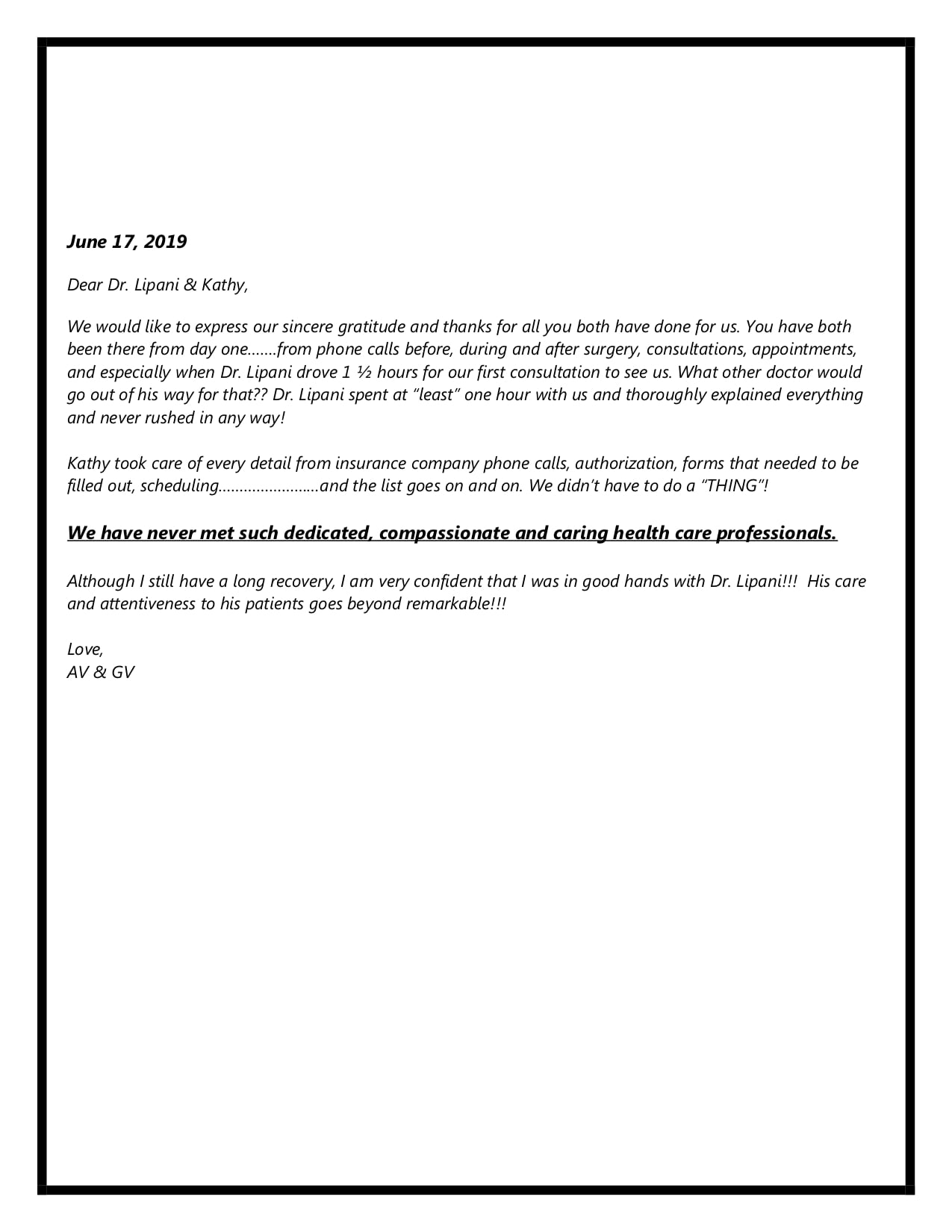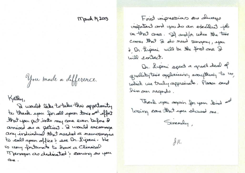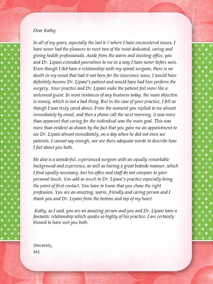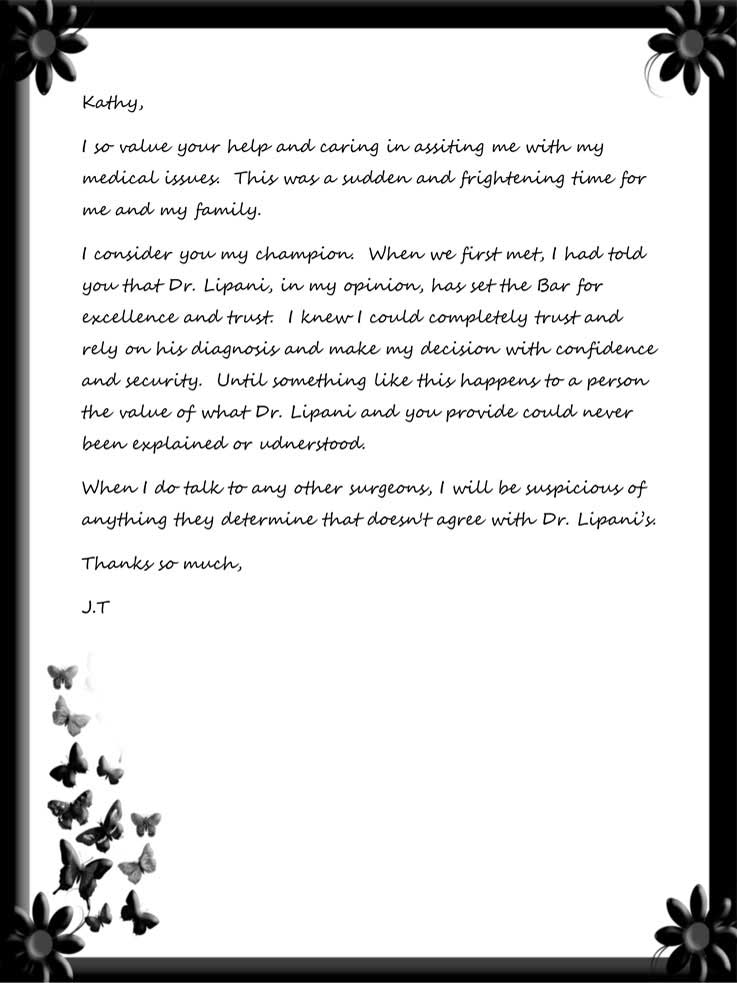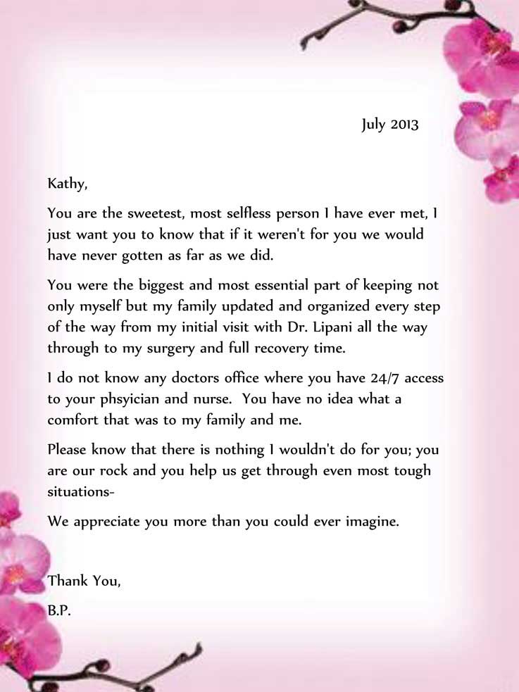 I cannot begin to express my gratitude for all that you have done for me, and my family. You and Dr. Lipani entered our lives at the best possible moment. You are both so wonderful, and it was such a relief to know that I was in good hands. It is rare for a patient to find a medical team that goes above and beyond for them like you two have done for me. Thank you so much for the letter – and for everything else.